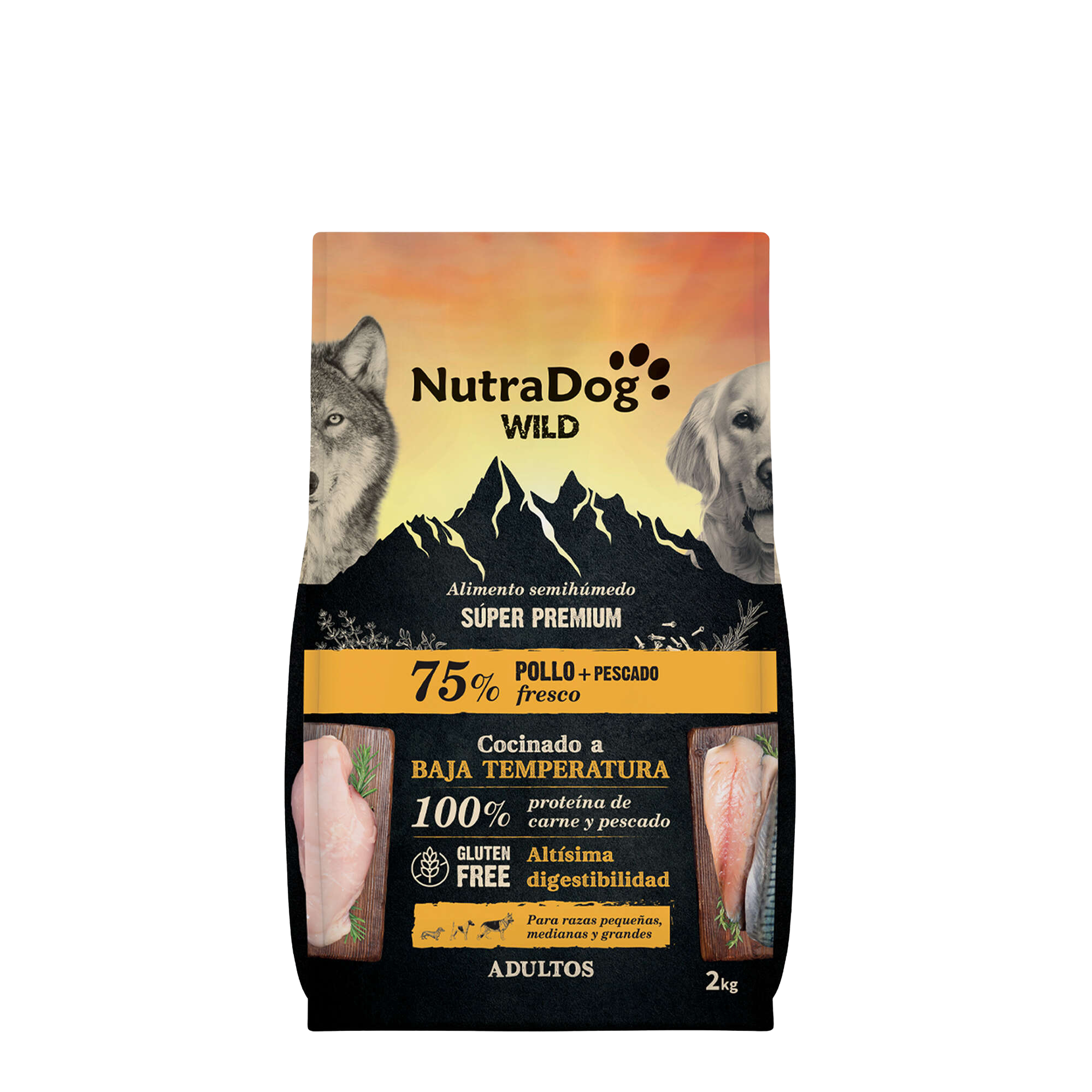 NutraDog WILD 75% Frango + Peixe é um alimento saboroso para cães que contém 55% de frango fresco e 20% de peixe fresco . É ideal para cães adultos ativos que precisam de uma dieta equilibrada e de fácil digestão.